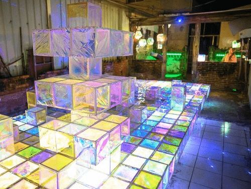 走進(jìn)廢墟裡,地板整齊排列著繽紛的方塊,這些方塊體看起來是用玻璃紙去設(shè)計的,摸起來輕薄,所以不可以坐在作品上。冰晶方塊魅力四射,再搭配燈光的照射,滿分覺得好像來到璀璨的冰晶殿堂,月之故事館的幻彩結(jié)晶也非常受歡迎。